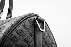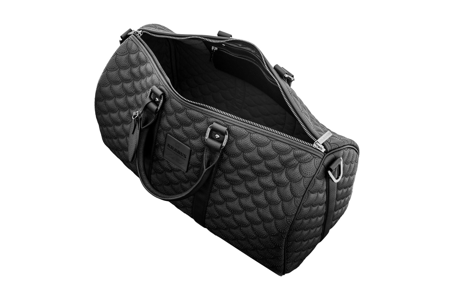 Stilvolle Weekender-Tasche aus dem gleichen hochwertigen Leder, das auch in den Interieurs unserer exklusivsten Supercars verwendet wird. Das komplett schwarze Design zeichnet sich durch die BRABUS „Shell“ Steppung sowie präzise Perforationen aus. Passende Biesen und Nähte im gleichen monochromen Farbton setzen zusätzliche, edle Akzente. Eine BRABUS „Masterpiece“ Plakette ziert die Vorderseite. Sämtliche Metallelemente sind in BRABUS „Shadow Chrome“ ausgeführt.